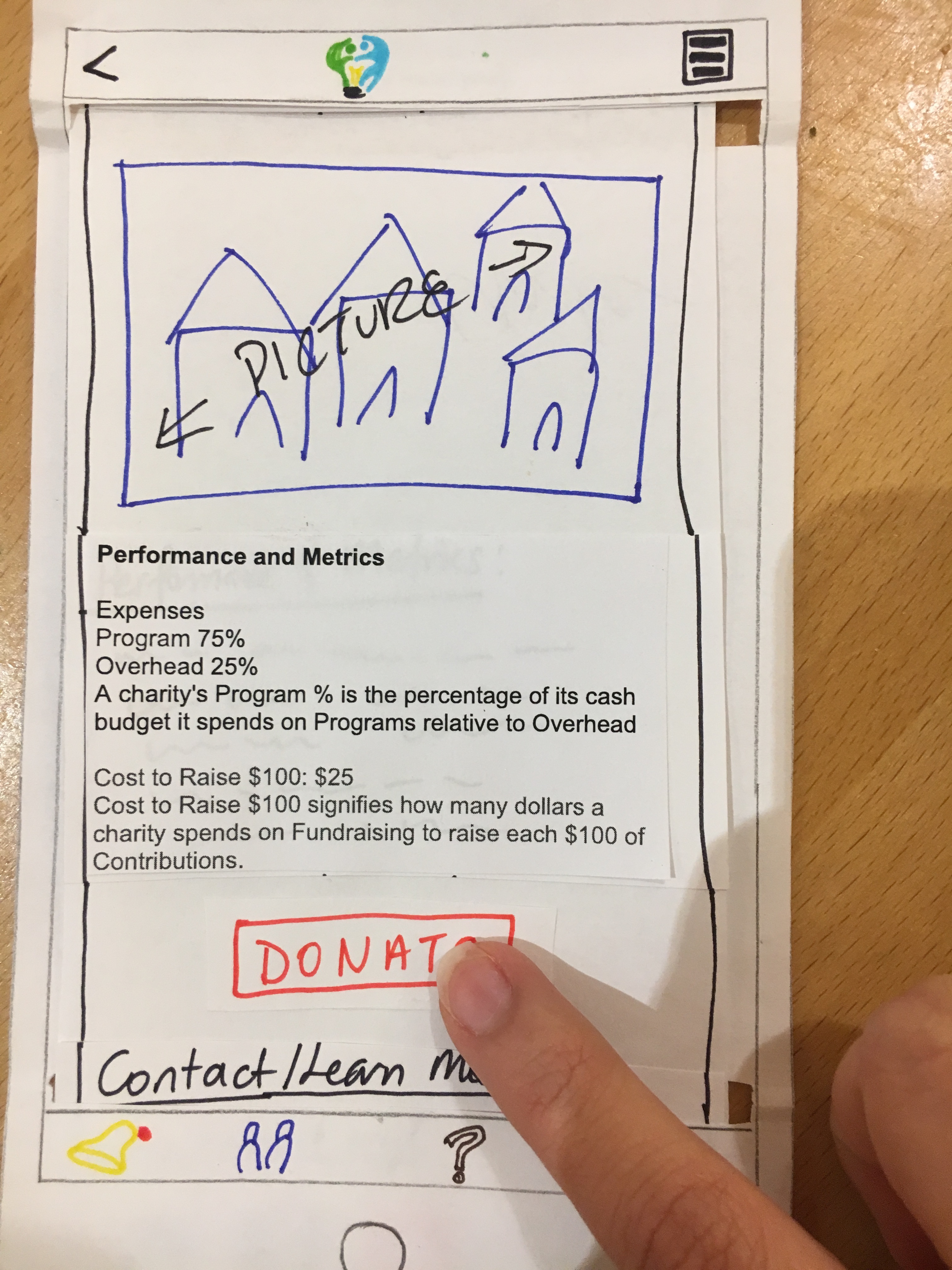 Our mobile app prototype walks users through the tasks of 1)learning about effective charities and 2)giving effectively without sacrificing too much convenience, which were previously illustrated more specifically in our storyboards.